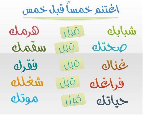 لا ت ز ول ق د م ا ع ب د ي و م الق ي ام ة ح ت ى ي س أ ل ع ن ع م ر ه ف يم ا أ ف ن اه و ع ن ع ل م ه ف يم. لا تزول ق د م ا عبد يوم القيامة حت ى ي سأل عن أربع ع ن ع م ر ه فيما أفناه وعن جسد ه فيما أبلاه وعن ع لم ه ماذا ع م ل فيه وعن مال ه م ن أ ي ن اك ت س ب ه وفيما. قال رسول الله صلى الله عليه وسلم. قال رسول الله صلى الله عليه وسلم.