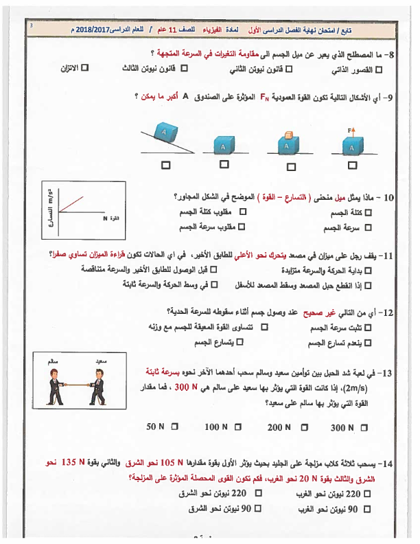 Physics Shadows نموذج اختبار الفيزياء للصف العاشر الفصل الدراسي الثاني منطقة أم القيوين العام الماضي